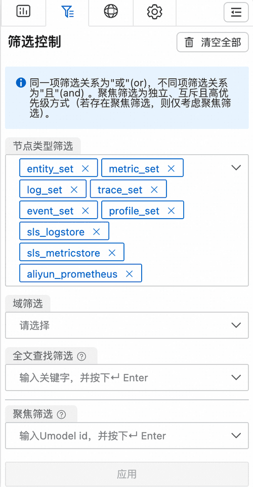 前三种筛选类型(节点类型筛选、域筛选、全文查找筛选)作为一组,它们之间的逻辑关系是:同一项内为"或"关系,不同项之间为"且"关系。举个例子,如果用户在节点类型筛选中选择了 entity_set 和 metric_set,在域筛选中选择了 domain1 和 domain2,那么系统会显示所有类型为 entity_set 或 metric_set,且域为 domain1 或 domain2 的元素。全文查找筛选的使用需要注意,输入关键词后需要按回车键才能提交。