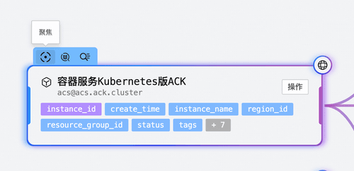 每个节点在鼠标悬停时,左上角都会显示一个操作菜单。这个菜单提供了该节点类型特有的快捷操作。所有节点都至少有一个"聚焦"操作,点击后会将该节点设为聚焦筛选条件,画布会自动调整视图,只显示该节点及其相关的邻居节点。