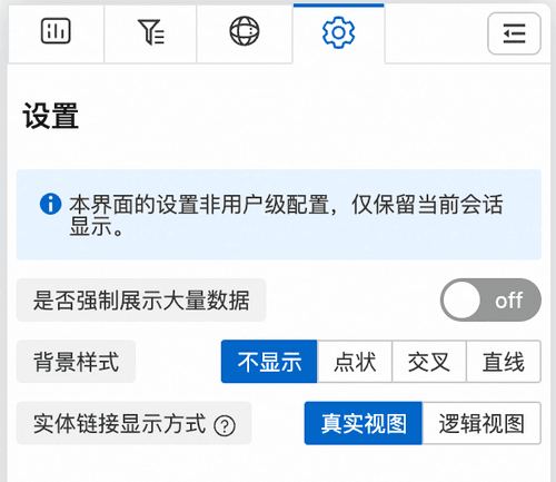 最重要的设置是"强制全量显示"开关。当画布上的节点数量超过一定阈值(默认 50 个)时,系统会在页面底部显示提示,告知用户当前只展示了部分节点。这是出于性能考虑的设计,因为当节点数量很大时,全部渲染会导致严重的卡顿,影响使用体验。如果用户确实需要查看全部节点,可以在设置页打开"强制全量显示"开关。
