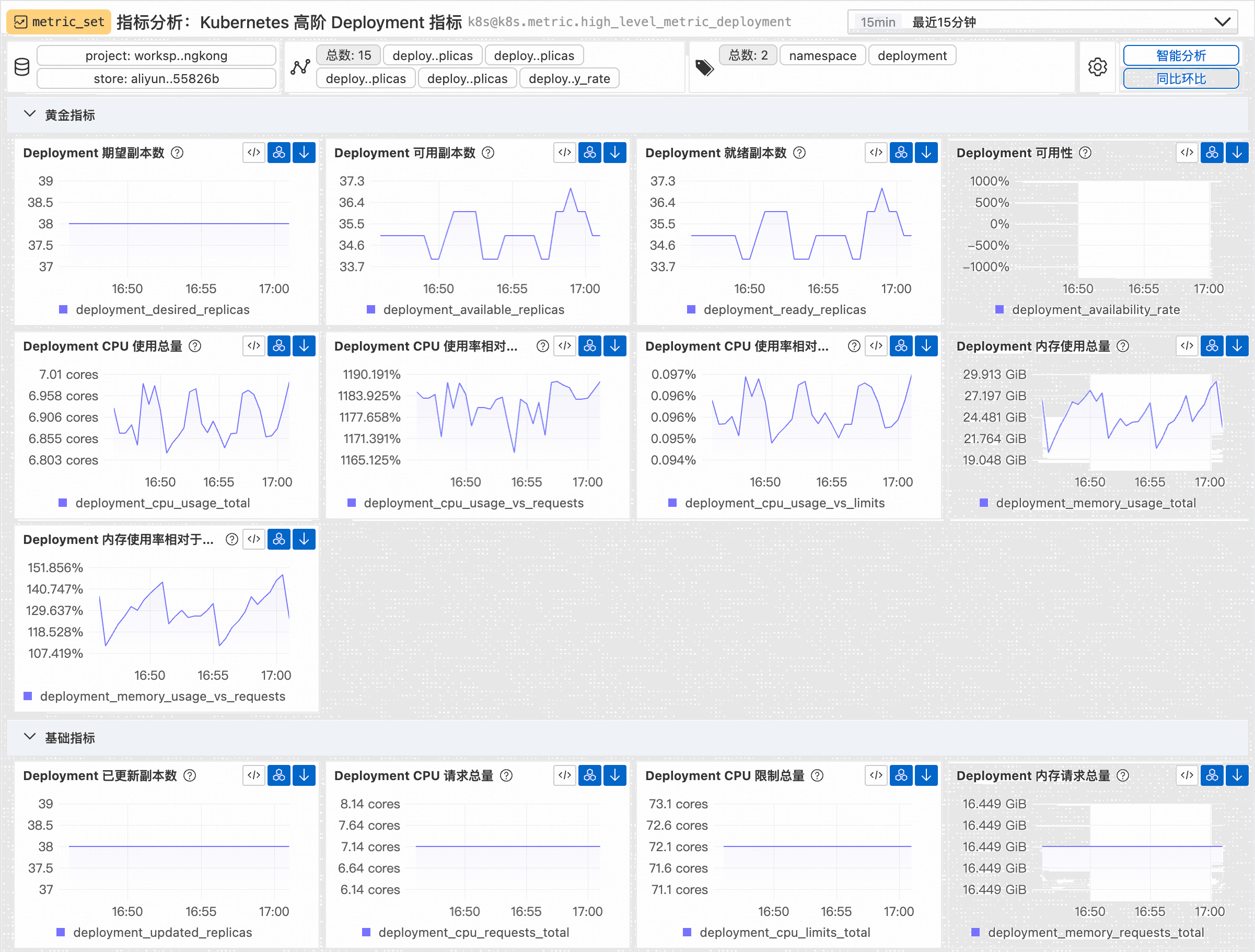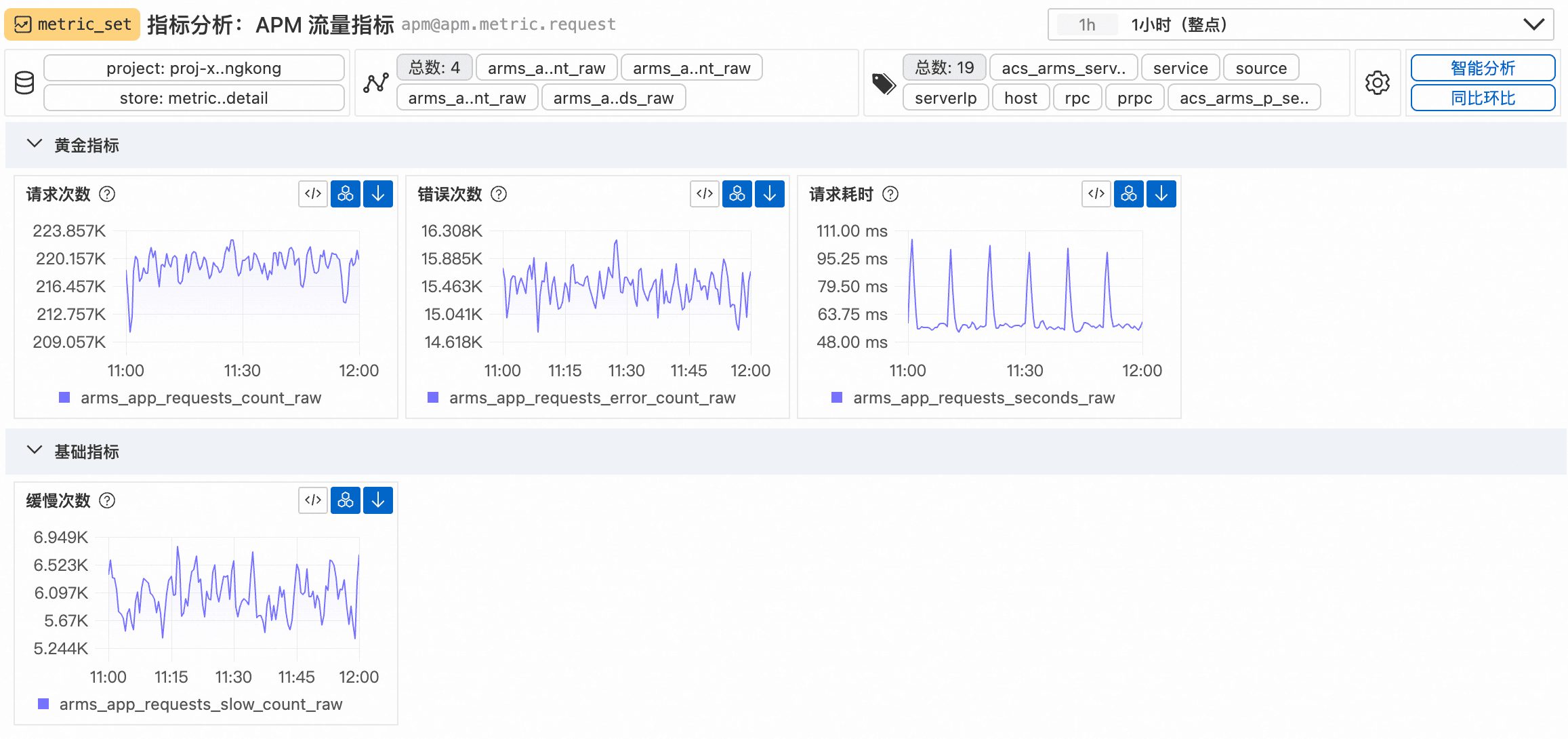 在普通视图下,指标按照黄金指标和基础指标分类展示。黄金指标通常是对系统健康度最有代表性的几个核心指标,比如请求延迟、错误率、吞吐量等。这种分类方式源于 SRE 实践中的最佳实践,能够帮助用户快速抓住系统的关键状态。