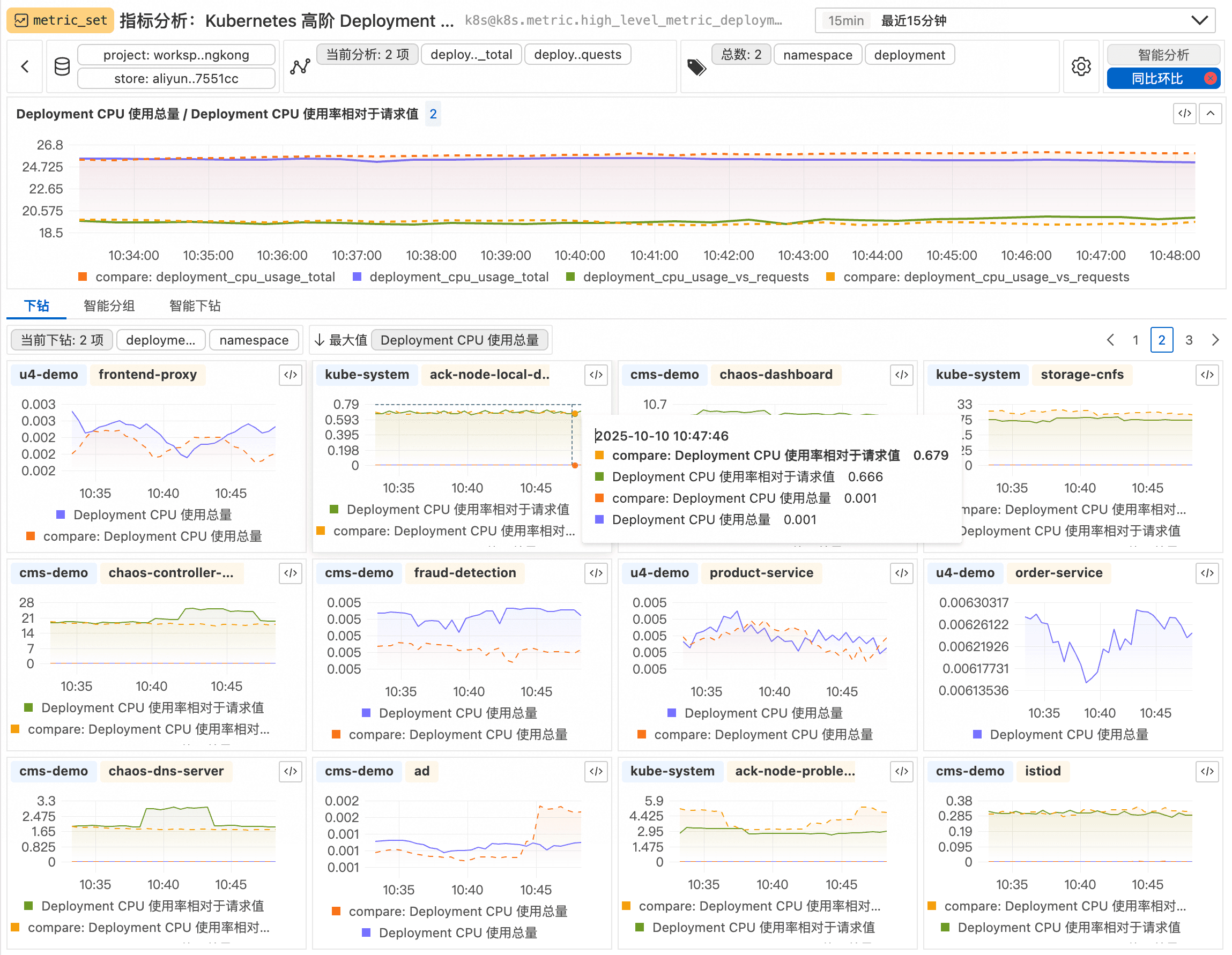 详情模式下支持同时添加多个指标进行对比。这在分析指标间的相关性时非常有用。比如同时查看 CPU 使用率和请求延迟,可以直观判断性能瓶颈是否与资源有关。