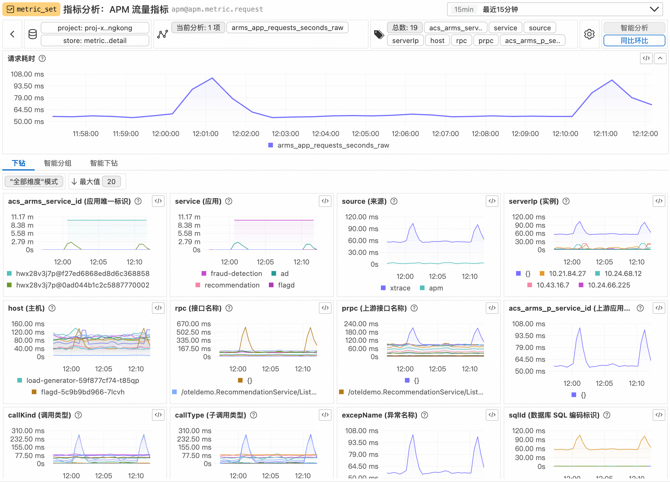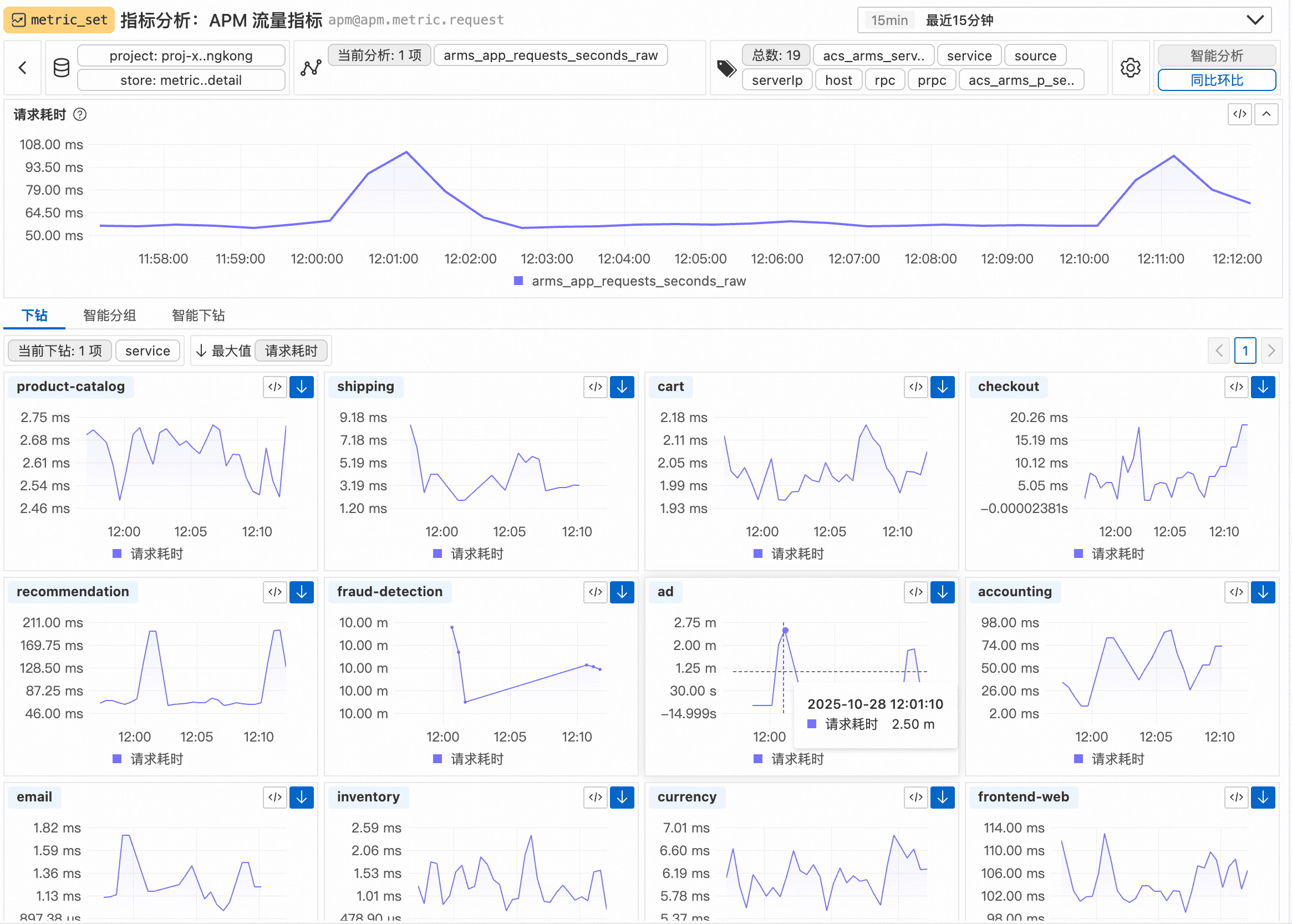 举个例子,假设我们发现请求延迟指标出现了尖峰。首先在概览页点击该指标进入详情,此时看到的是全局聚合后的曲线。接下来选择一个维度进行下钻,比如按"服务"分组。系统会立即展示每个服务的延迟曲线,很可能我们会发现某一个服务的延迟特别高。