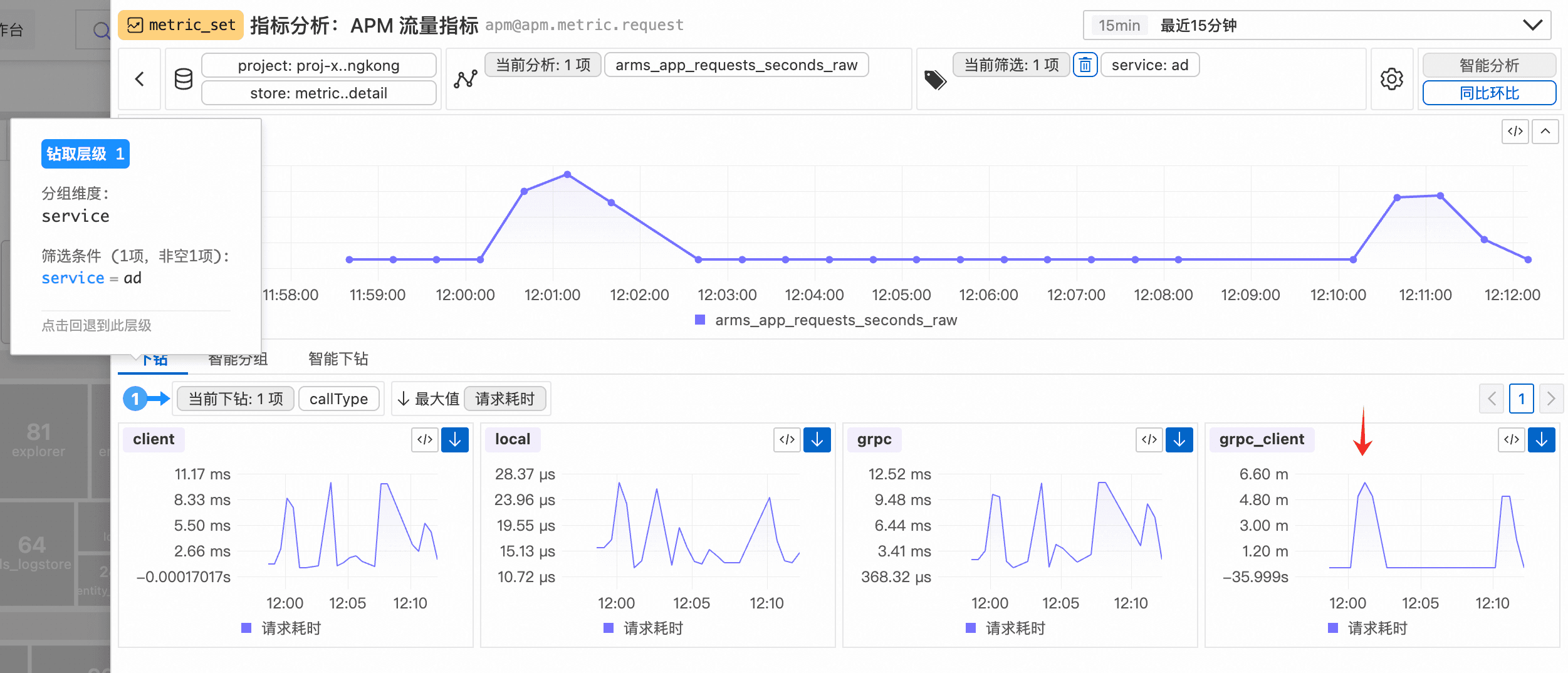 继续深入,选中这个异常服务,再按"调用类型"下钻。