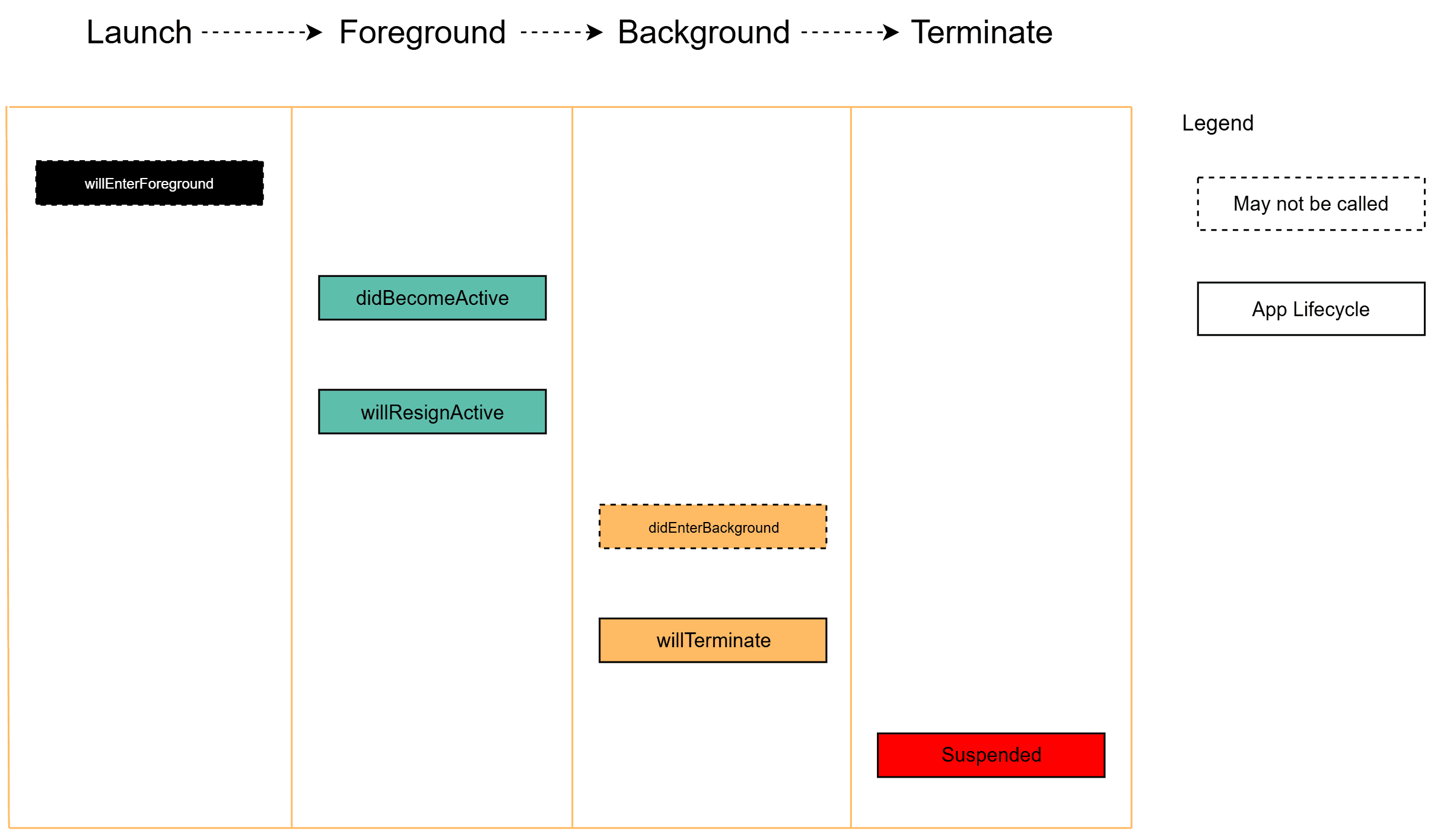如上图所示,是iOS应用从启动到终止过程(包含前后台切换),系统通过事件通知中心对外暴露的事件状态变化。SDK通过注册这些事件完成应用状态事件的采集。