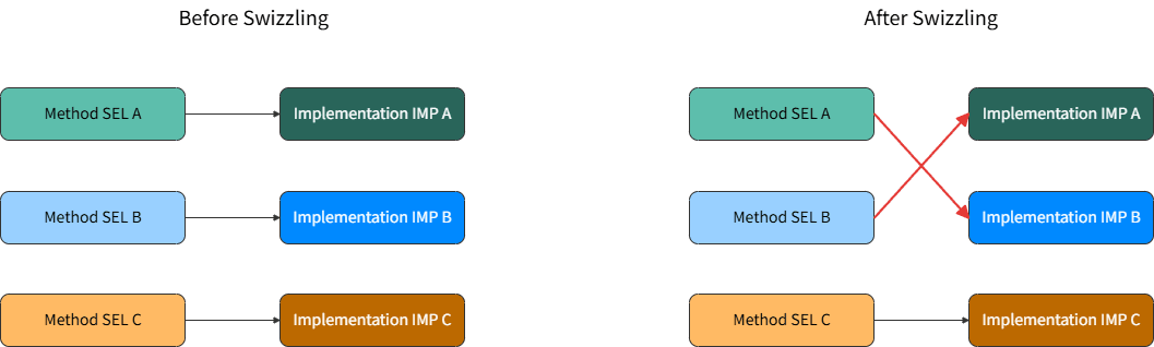 Method Swizzling被称为动态方法交换技术,用于改变一个已经存在的selector实现。基于此技术,SDK可以在程序运行时,通过改变selector所在Class的method list的映射,从而改变方法的调用,本质上是交换两个方法的IMP。