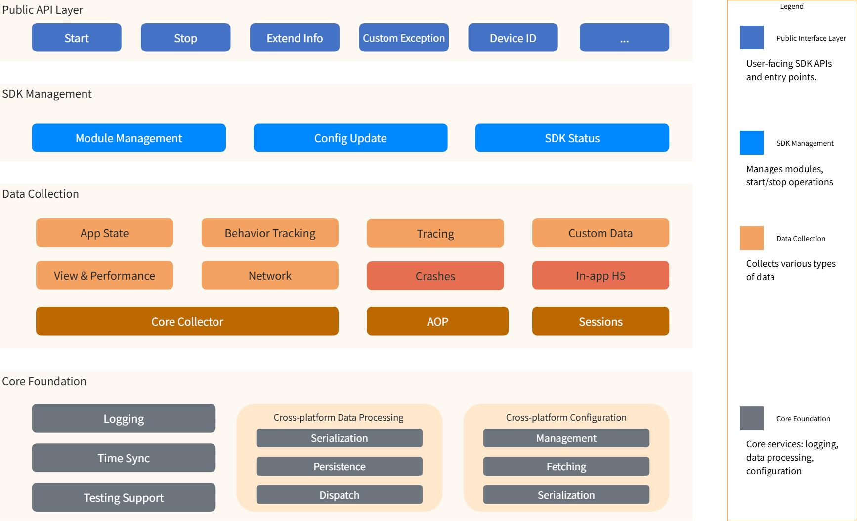 - 基础核心层:支撑整个SDK的运行,提供时间同步,数据处理,配置管理等能力