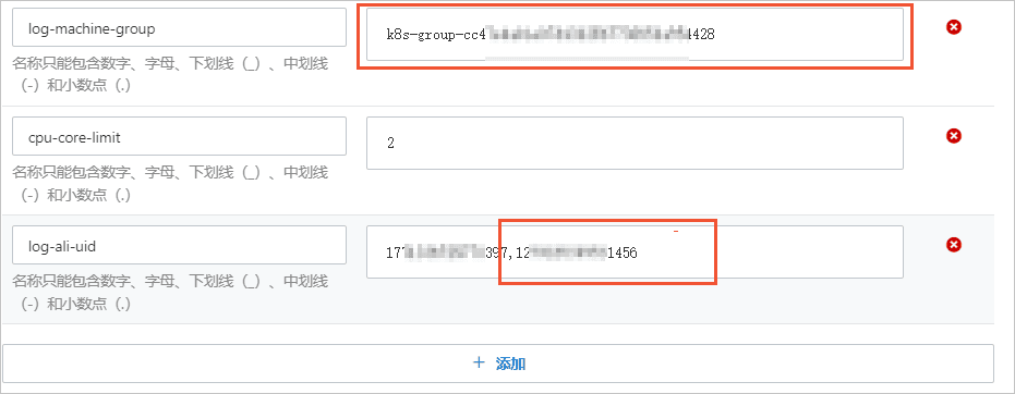 - 编辑log-ali-uid的值,添加B账号的uid(多个账号之间使用半角逗号(,)相隔,例如17****397,12****456)