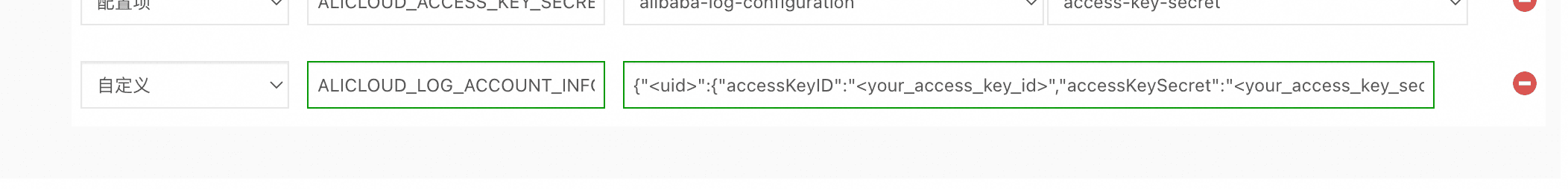 - 添加环境变量ALICLOUD_LOG_ACCOUNT_INFOS={"":{"accessKeyID":"<your_access_key_id>","accessKeySecret":"<your_access_key_secret>"}},这里的uid是B账号的,ak/sk需要具备SLS相关的权限。