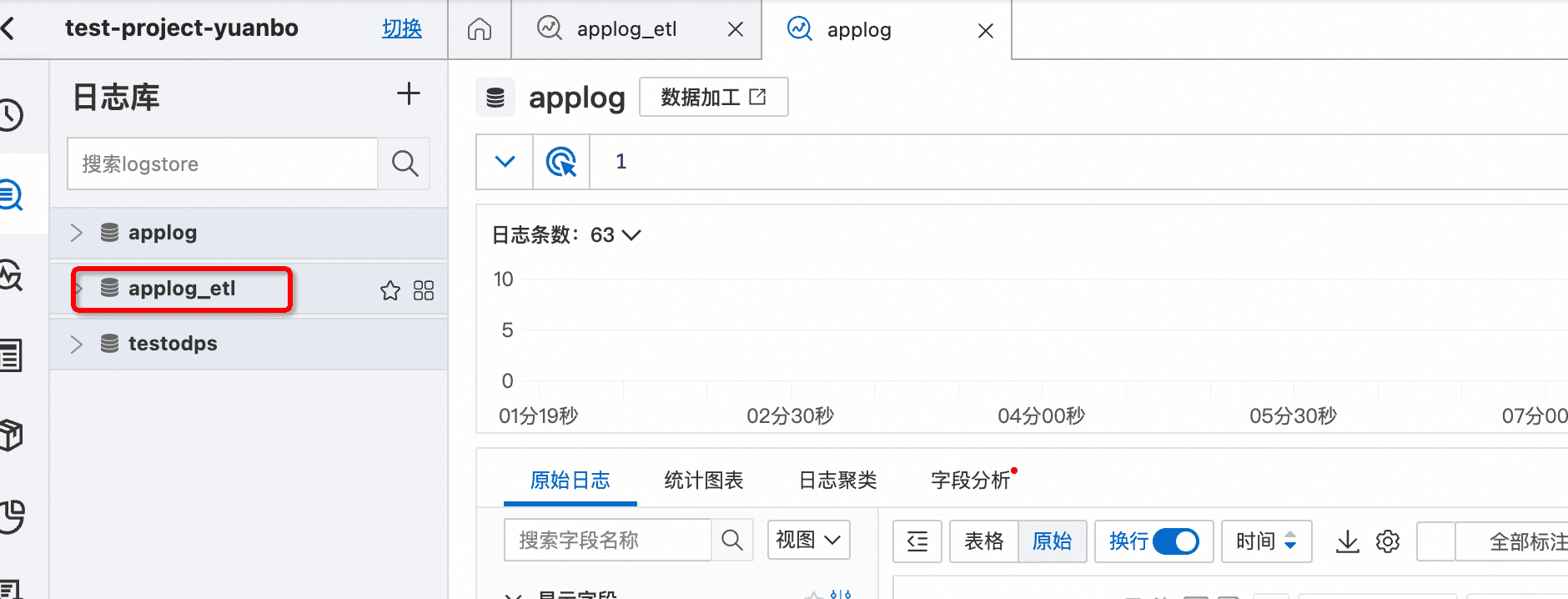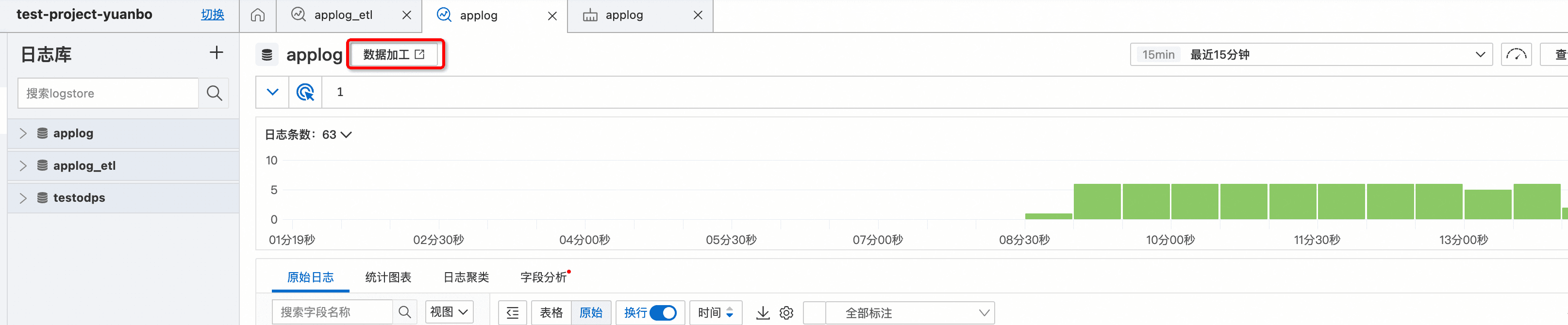 您可以通过Logstore名称右侧的“数据加工”超链接进入到数据加工配置页面。