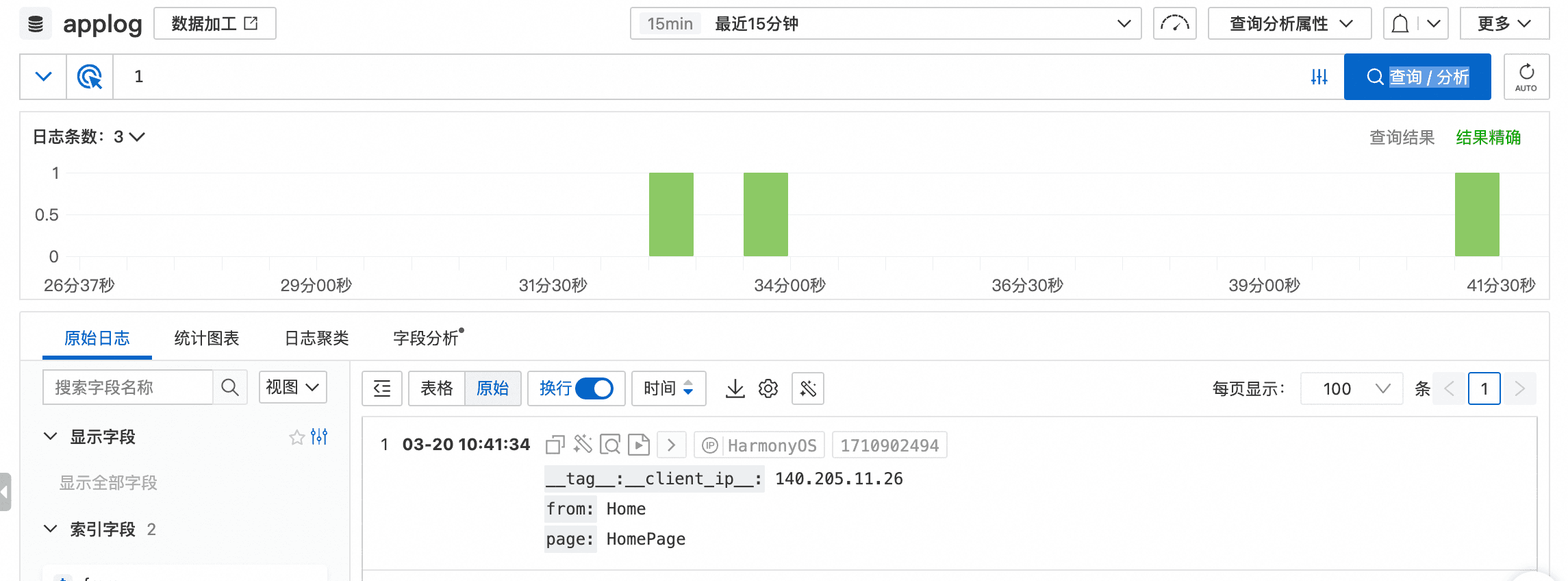 索引开启后,即可在Logstore页面看到我们上报的日志信息,如下: