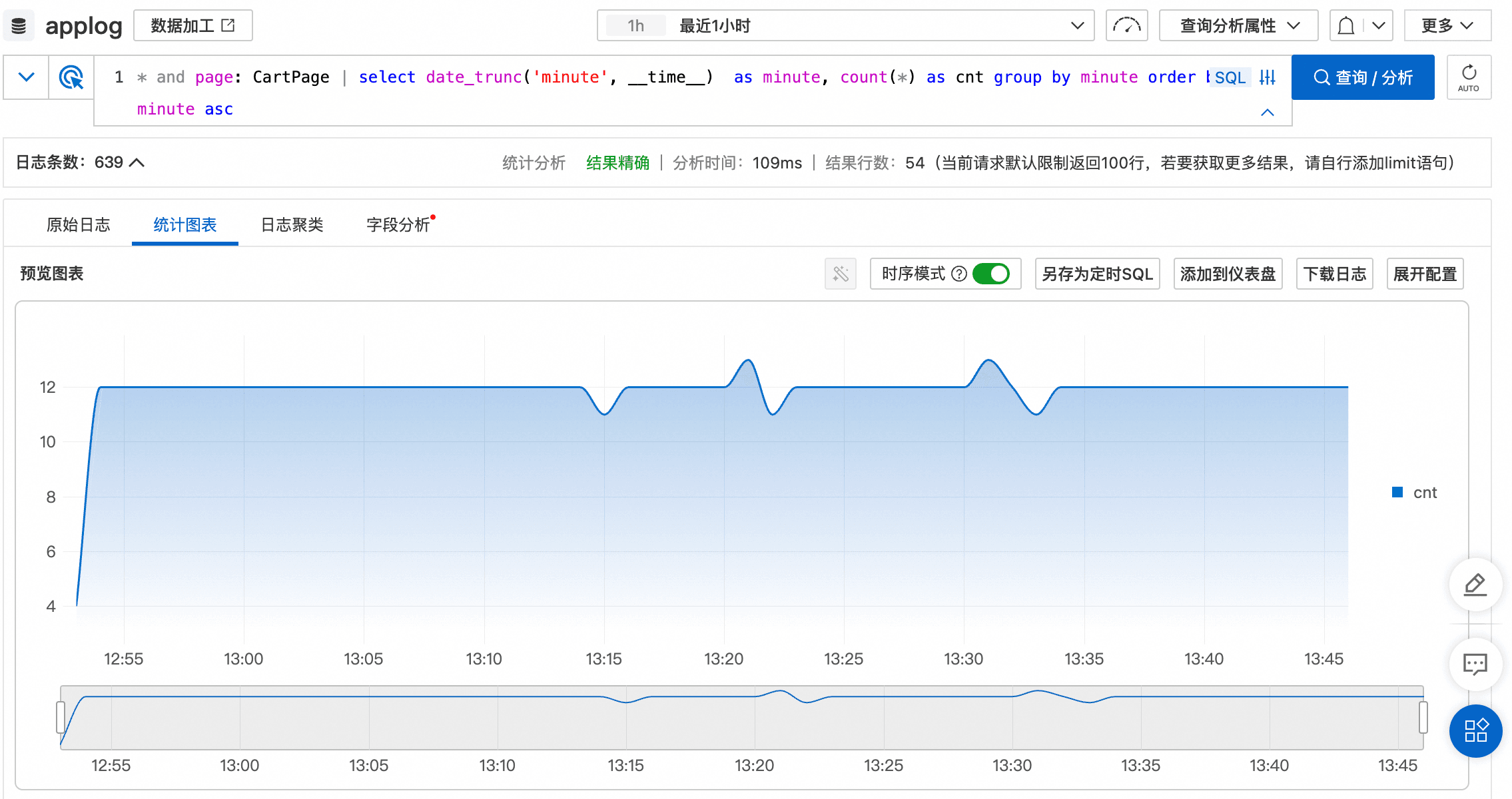 - “|”之后的部分,是通过SQL语句对过滤出来的数据进行分析,即:通过date_trunc语句把时间对齐到分钟级别,然后使用count(*)计算出每分钟页面的访问次数。请参考更多关于分析语法的信息。