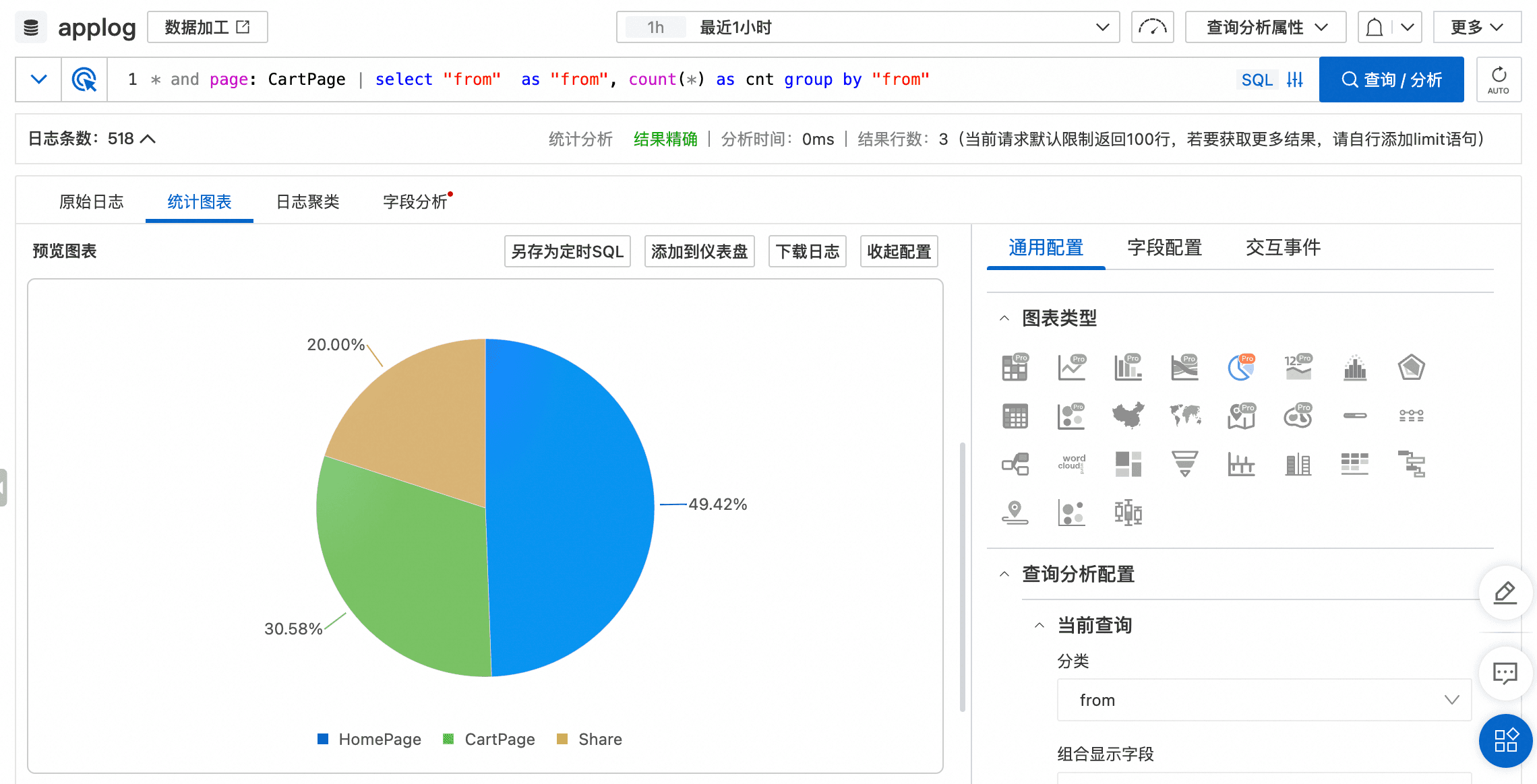 基于示例数据,可以使用如下查询分析语句查询Cart页面的来源分布: