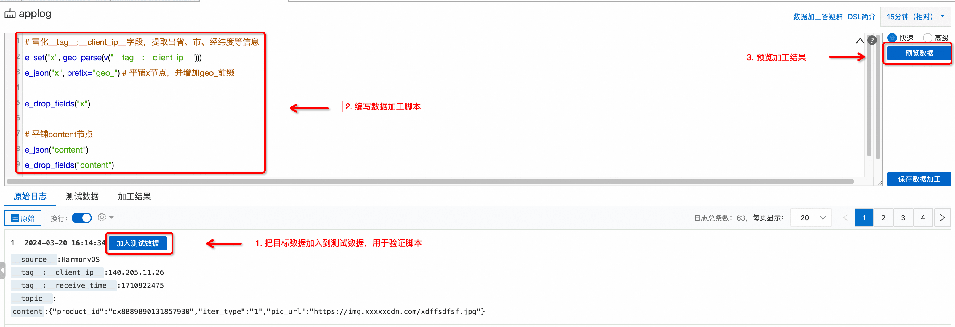 如果从鸿蒙设备上采集到的原始数据格式没有事先约定好,或者数据格式较为复杂,或者需要对个别字段做富化/脱敏等,您可以使用SLS数据加工能力对原始数据做富化和清洗。您可以参考以下步骤。